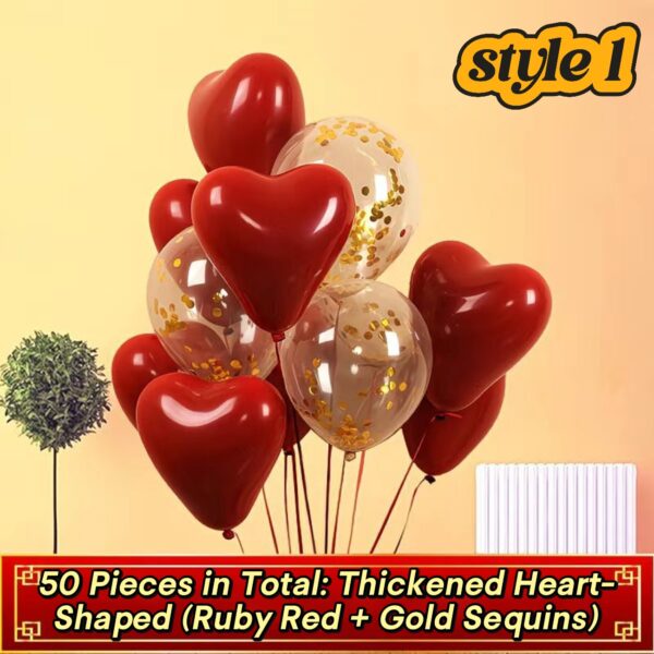 1.Extra-Thick Ruby Red Heart-Shaped Balloons with Gold Sequins – 50-Piece Set